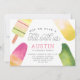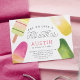 Zu den bezaubernden Party Einladungen für die Sommergeburtstagsparty Ihres Kleinen zählen vier Aquarellbilder in lebhaften Rosa- und Kalkgrün mit "Pop auf uns und Chill bei uns" in kluger Schrift. Personalisieren Sie Ihre Geburtstagsfeierdetails unten.