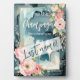 Begrüßungszeichen mit dem Text "Pop der Champagner, sie ändert ihren Nachnamen!" Wasserfarbener indigofarbener Hintergrund mit dekorativen rosa Rosen und Blattwerk.