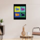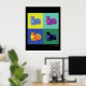 Ein Foto eines Eichhörnchens, das in einem Pop-Kunststil in Blau, Grün, Gelb, Orange, Türkis und lila gehalten ist, auf einem Poster mit schwarzem Hintergrund