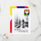 Eine modische, designgeführte Save the Date-Fotokarte mit einem hellen FarbenPop im CMYK-Druckstil.