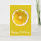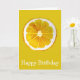 Eine niedliche und farbenfrohe Geburtstagskarte mit einer lebendigen Zitrusscheibe aus Zitrusgelb aus einem Originalgemälde der Künstlerin Sacha Grossel. Diese große Frucht im Pop-Stil ist gelb und sehr hell und farbenfroh, vor einem kanarisch-gelben Hintergrund. Quirkisch und originell.