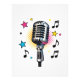 Bright and playful illustration of a pop microphone surrounded by colorful stars and musical notes on a clean white background.