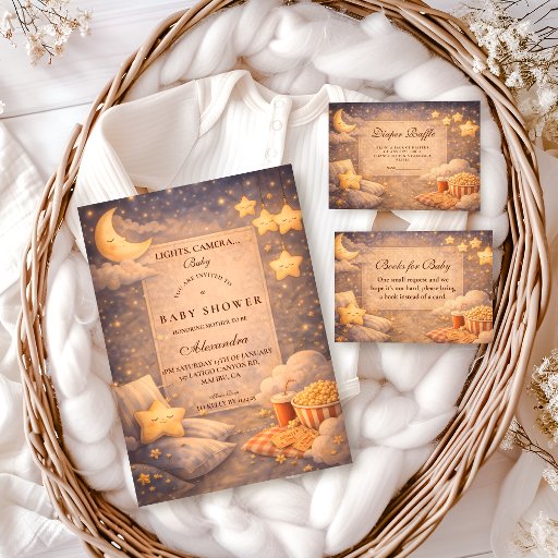 Schaffen Sie die Kulisse für eine gemütliche, kinoähnliche Feier mit diesem filmthematischen Baby-Shower-Design. Inspiriert von einer warmen Heimkino-Nacht, zeigt das Kunstwerk leuchtende Lichterketten, klassische Popcorn-Eimer, weiche Decken und ein nostalgisches Filmleinwand-Mittelstück, das sofort eine entspannte, intime Atmosphäre schafft.