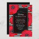 Chic und moderne Hochzeitseinladung mit roten Pappeln gegen schwarz-weiße Streifen.