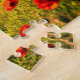 A warm summer cottage in evening surrounded by a vibrant poppy field, with a wooden path leading through the blossoms and a shy deer watching from the edge of the meadow.