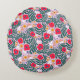 This pillow features a vibrant, playful floral pattern designed in a contemporary "folk art" or "scandi" style. Bold red poppies with dark blue centers. Deep forest-green fern-like leaves that curve around the primary flowers, creating a sense of movement. Small yellow five-petal flowers, tiny blue berries, and wispy white organic shapes that add brightness.