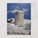 Ein modernes tragbares Outdoor-Haus sitzt an einem hellen Wintertag gefroren in einer Schneeabdrift, gewartet, um zu dienen. Ein Kalender 2013 schmückt die Rückseite. Fügen Sie Ihren Firmennamen oder Ihr Logo in den Raum oben ein.