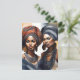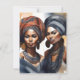 Zwei Frauen werden mit lebendigen Kopfhüllen und großen Ohrringen dargestellt, die ein Gefühl von kulturellem Reichtum und Eleganz ausstrahlen. Ihre Ausstattung umfasst aufwändig gestaltete Halsketten, die den Sinn für Stil und Tradition noch verstärken.