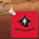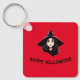 Die Vorderseite des Schlüsselanhängers zeigt das Porträt einer jungen Hexe mit langen schwarzen Haaren und einem schwarzen spitzen Hut auf rotem Hintergrund, zusammen mit den Worten "Happy Halloween!". Der Schlüsselanhänger kann leicht personalisiert werden.