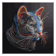 Ein künstlerisches Portrait mit einem Katzenkopf aus verspieltem Weiß und farbenfrohen Linien. Set vor einem dunklen Hintergrund, bringt dieses abstrakte Design den felinen Charme zum Leben in einer skurrilen und fantasievollen Komposition.