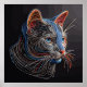 Ein künstlerisches Portrait mit einem Katzenkopf aus verspieltem Weiß und farbenfrohen Linien. Set vor einem dunklen Hintergrund, bringt dieses abstrakte Design den felinen Charme zum Leben in einer skurrilen und fantasievollen Komposition.