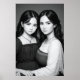 Ein Schwarz-Weiß-Portrait von Mutter und Tochter mit langen schwarzen Haaren, in denen beide weiße und schwarze Kleidung tragen. Das ist eine künstlerische KI.
