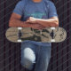 Porträt in voller Länge eines Samurai-Kriegers C. Skateboard
