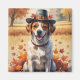 Ein Aquarellbild eines fröhlichen Hundes inmitten eines Haufen lebendiger Herbstlaub, umgeben von winzigen Kürbissen und verstreuten Eichhörnchen. Der Hund trägt einen kleinen Pilgerhut und strahlt vor Freude aus, um den Geist des Erntedanks zu erfassen. Im Hintergrund sorgen weiche Erntefelder und goldfarbene Bäume für eine friedliche Landschaft. Die sanfte Struktur und die warmen, gedämpften Herbsttöne verleihen der Szene ein gemütliches, nostalgisches Gefühl, das perfekt ist, um die Schönheit der Saison zu feiern.