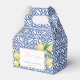 Stilvolle Gefälligkeitsboxen mit Vintagem, blau-weißem Fliesenmuster, handgemalten Aquarelllemonen und kalligrafischem Schriftart.