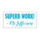 Dieses motivierende Design aus Gummi-Briefmarke zeichnet sich durch die motivierende Botschaft "SUPERB WORK!" und einen individuellen Lehrernamen aus. Es könnte von einem Lehrer, Pädagogen oder Tutor verwendet werden, um zu bestätigen, dass ein Schüler gut abgeschnitten hat.