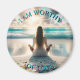 Ein Magnet mit einer positiven Bestätigung zitiert. Ich bin der Liebe würdig. Ai Art Illustration einer Frau, die von den klaren, blauen Wellen des Ozeans meditiert, umgeben von Meerglas, an einem Sandstrand, mit schönen Wolken, die am Himmel schweben.