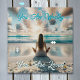 Puzzle mit einer positiven Bejahung Zitat. Du bist würdig, du wirst geliebt. Ai Art Illustration einer Frau, die von den klaren, blauen Wellen des Ozeans meditiert, umgeben von Meerglas, an einem Sandstrand, mit schönen Wolken, die am Himmel schweben.