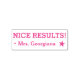 Dieses ermutigende Design der Gummi-Briefmarke zeigt die positive Botschaft "NICE RESULTS!" und den Namen eines personalisierten Pädagogen. Es hat auch eine dekorative Sternform. Es könnte von einem Lehrer oder Erzieher verwendet werden, wenn sie Aufgaben markieren, um anzuerkennen, dass der Schüler gut abgeschnitten hat.