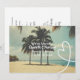 Ideal für Paare, die in Mexiko heiraten und bei ihrer Rückkehr ihre Hochzeit mit Freunden und Zuhause feiern möchten. Schöne tropische Bäume und blauer Himmel Foto-Image und hübsche weiße Perlen in Form eines Herzens und süße goldene Liebe Herzen