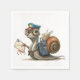 Eine als Postarbeiter verkleidete kahle Schnecke, mit einer blauen Kappe mit Abzeichen, großen Gläsern und einem Rucksack voller Post