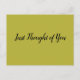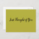Klassische, aber einfache Postkarte für jene Zeiten, wenn Sie einen bestimmten flüchtigen Gedanken über jemanden haben und wollte, "schnell" lassen, sie wissen. Ein Anruf wird sicherlich tun, aber dieser spezielle Sake hält für die Dauer, wie lange der Empfänger sich wünscht. Erleben Sie jemanden mit Ihrer Nachsicht und überraschen Sie ihn! Es gibt viele Farben und eine Vielzahl von Nachrichten, aus denen Sie auswählen können.