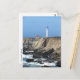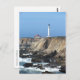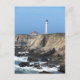 Leuchtturm in Point Arena, Kalifornien. Wellen brechen an der felsigen Küste unter den Klippen auf. Hellblauer Himmel.
