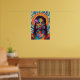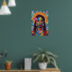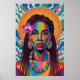 This stunning wall art poster is an explosion of vibrant hues and intricate patterns, celebrating the beauty and strength of a woman adorned in traditional and artistic elements. The central figure's face is a masterpiece of geometric abstraction, with bold, contrasting blocks of color – including deep greens, blues, reds, and yellows – forming her features and highlighting her striking eyes.