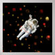 Der Astronaut, der zwischen den Sternen schwebt, ist ein rotes, gelbes, grünes Feuerwerk gegen den schwarzen Himmel, das den Astronauten in weißem extra vehikulärem Anzug bildet.