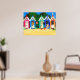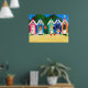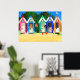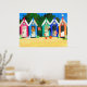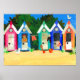 Ein großes Poster einer handbemalten Papierkollektion mit Strandhütten.