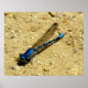 Drache fliegt direkt auf den Betrachter. Brillant blauer und schwarzer Körper, zeigt einen Schatten darunter. Die durchsichtigen Flügel sind zusammengefaltet. Der Kopf ist so geneigt, dass die Augen auf die Kamera schauen.