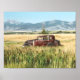Poster mit einem Bild eines antiken Autos mit einem Baum, der durch das Dach in der Mitte eines Feldes in Montana wächst.