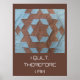Quilt Block in braunem und blauem "Schloss" Muster. Die zentrale Burg ist eine braune Sternform, umgeben von der "6-seitigen Mauer" mit den "Uhrentürmen", die sich von der Mitte der Wände ausbreiten. Text ist in "Stich" Schriftart (kann personalisiert sein): "Ich quilt, also bin ich". Personalisieren Sie mit dem eigenen Bild und passen Sie den Hintergrund an, um ihn zu koordinieren.