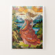 Dieses lebendige Glaskunstwerk zeigt eine wunderschöne Frau in einem verzierten, fließenden Kleid, ihr langes Haar kaskadiert anmutig auf einer felsigen Landschaft. Die Frau scheint einen atemberaubenden Blick zu genießen, der majestätische Berge, einen ruhigen See und einen dramatischen Himmel umfasst. Das Kunstwerk ist reich an Details, mit kühnen, bunten Scheiben, die einen dynamischen Kontrast zwischen der Figur und der natürlichen Szene schaffen. Der Buntglaseffekt steigert die Schönheit der Landschaft und die Eleganz der Frau und ist somit perfekt für ein beeindruckendes Poster oder Wandkunstwerk, das Schönheit und Ruhe ausstrahlt.