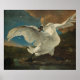 Poster des Gemäldes "Der bedrohte Schwan" des holländischen Goldalters Jan Asselijn. Der bedrohte Schwan, der einen Schwan aggressiv zur Verteidigung seines Nestes darstellt, wurde zu einem Symbol des nationalen Widerstands der Niederlande, obwohl unbekannt ist, ob Asselijn dies beabsichtigt. Insbesondere wurde es als Darstellung von Johan de Witt interpretiert. Mehrere Inschriften wurden von späteren Eigentümern des Gemäldes hinzugefügt, darunter "Holland" auf einem der Eier und "Feind des Staat" neben dem Hund, der das Nest bedroht. Manche Teile des Gemäldes sind weniger realistisch als der Schwan, wie die niedrig hängenden Wolken, der Hund und die flach aussehenden Eier. Das Gemälde stammt aus den 1640er Jahren. Es gilt als Asselijns bekanntestes Werk und war die erste Akquisition des Rijksmuseums. Quelle: Wikipedia