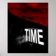 Das Poster des Klimawandels in Rot und Schwarz mit feurig roter Landschaft und schwarz-weißer Uhr und weißem Text.