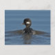 Eine hübsche Bufflehead-Ente, die auf dunkelblauem Wasser von der Kamera wegschwimmt.