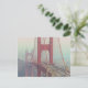 Das Bild zeigt eine teilweise Sicht auf die Golden Gate Bridge in San Francisco, die in Nebel verhüllt ist. Die markante Farbe Rot-Orange der Brücke ist sichtbar, was im Gegensatz zum grauen Nebel steht. Autos sind auf der Brücke zu sehen. Der Hintergrund ist durch den Nebel verschwommen. Die Stimmung ist insgesamt stimmungsvoll und ein wenig geheimnisvoll.