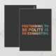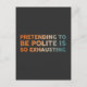 Zeigen Sie Ihre humorvolle Seite mit diesem witzigen Abschlag, perfekt für diejenigen, die vorgeben, höflich anstrengend zu sein. Ideal für Introvertierte und alle, die Ehrlichkeit schätzen, dieses Shirt erfasst den Kampf der sozialen Nettigkeiten. Tragen Sie es stolz und lass jedem weiß, dass es bei Ihnen um den behalt geht