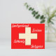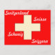 Eine Vintag aussehende Postkarte mit der Schweizer Flagge und den Worten "Schweiz , Schweiz , Schweiz , Svizzera" in weißen Buchstaben.