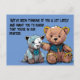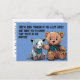 Auf dieser Postkarte findet man eine liebenswerte Illustration eines charmanten Teddybären und eines sanften Lamms, das in aufwändigen, farbigen Linien dargestellt ist. Der Teddybär mit seinem weichen Fell und seinem freundlichen Lächeln sitzt eng neben dem Lamm, das eine ruhige Ruhe ausstrahlt. Das Kunstwerk vermittelt ein Gefühl von Unschuld und Wärme und macht es zu einem reizvollen Anblick zu sehen. Die Rückseite der Postkarte kann mit dem Empfängernamen, einer Nachricht und Ihrem Namen personalisiert werden.