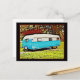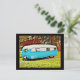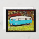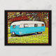 Altzeit RV. Der Retro-Caravan ist hell blau und weiß. Es ist umgeben von lebendigem Grün und ein kleiner Wald ist die Kulisse. Diese Foto-Kunst ist reine Nostalgie.