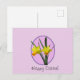 Gelbe Daffodien tauchen vor ovalem "Fenster" mit lila Schnitt auf. Hintergrund in hellen Lavendel, Innere von oval ein dunklerer Schatten. Der Text unten lautet "Happy Oaster!" und kann angepasst werden.