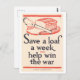 Dies ist eine Reproduktion eines Weltkriegs-Posters, das "Rett einen Laib pro Woche — hilf dabei, den Krieg zu gewinnen" liest. Es wurde 1917 von der US-Lebensmittelbehörde gegründet.