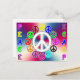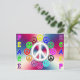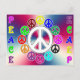 farbenfrohe Retro-Optik-Friedenskarte mit vielen farbigen, kleineren Friedensstipps, die ein größeres weißes umkreisen, das durch das Wort "Frieden" vertikal nach unten und oben aufgeschrieben wird