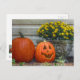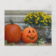 Ein Kürbis, Jack-o-Laternen und gelbe Mumm sind perfekt für ein Herbstdisplay.