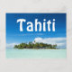 Postkarte mit einer wüsten oder unbewohnten Insel mit Kokospalmen in der Nähe von Tahiti in Französisch Polynesien im Pazifik mit dem Text: 'Tahiti'.