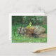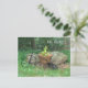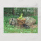 Hallo da ist in weißem Schrift geschrieben. Hübsche, rosa Blume in einem kleinen, altmodischen, schwarzen Gartenfahrrad im Gras mit Felsen und Bäumen im Hintergrund. HINWEIS: Gehen Sie zum Papiertyp und wählen Sie vor dem Auschecken die Option "Semi Gloss Postcards" aus. Original Fotografie von TamiraZDesign.