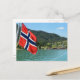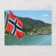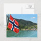 Postkarte der norwegischen Flagge auf einer Autofähre zwischen Solvorn und Urnes auf einem Fjord in Norwegen.