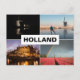Postcard mit einer Collage von vier holländischen Landschafts-Fotos, wie die Windmühlen von Kinderdijk in der Nacht, eine Windmühle mit Tulpen und Regenbogen, Eis-Skaten im Winter und die Amsterdamer Architektur und der Text: 'Holland'.